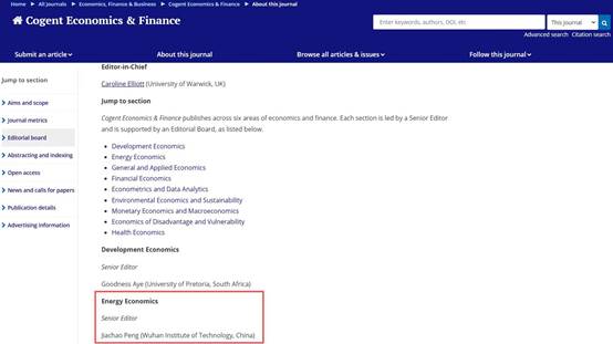 (通讯员 穆海梅)近日,彭甲超博士受邀担任国际高水平期刊《Cogent Economics & Finance》能源经济领域主编。这一任命不仅是对彭甲超博士个人学术成就的高度认可,也标志着武汉工程大学在能源经济研究领域的影响力进一步提升。自加入领域主编以来,期刊JCR分区从 Q2升入Q1区,影响因子从2.0上升至2.5,并在2025年首次归属中科院(CAS)三区。