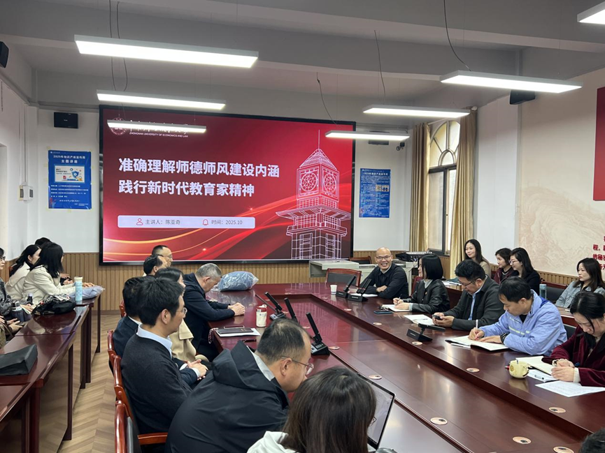 (通讯员 贺阳)为进一步加强学院师德师风建设,引导全体教师深刻理解新时代师德师风内涵,弘扬和践行教育家精神,10月30日,法商学院(知识产权学院)举行师德师风建设专题讲座。本次讲座特邀中南财经政法大学外语学院党委书记陈亚奇担任主讲嘉宾。学院全体教职工参加学习,讲座由学院党委书记陈朝娟主持。